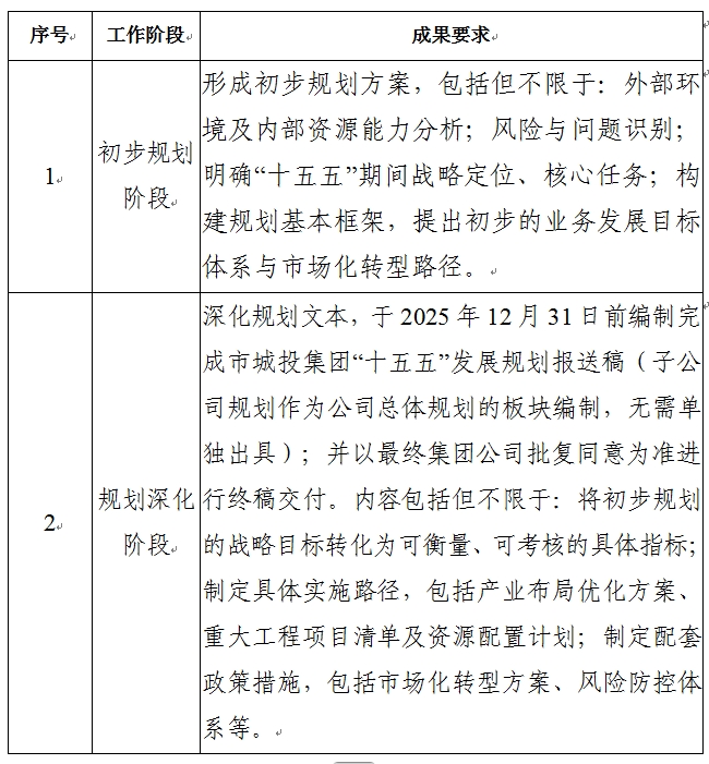 1.服務(wù)內(nèi)容:本次采購(gòu)旨在選取專(zhuān)業(yè)規(guī)劃咨詢(xún)服務(wù)單位,通過(guò)專(zhuān)業(yè)機(jī)構(gòu)的深度謀劃,助力集團(tuán)公司在“十五五”期間明確發(fā)展方向,優(yōu)化資源配置,提升核心競(jìng)爭(zhēng)力,為實(shí)現(xiàn)遠(yuǎn)期戰(zhàn)略目標(biāo)奠定堅(jiān)實(shí)基礎(chǔ)。服務(wù)內(nèi)容包括但不限于:外部環(huán)境及內(nèi)部資源能力分析、企業(yè)發(fā)展規(guī)劃目標(biāo)及業(yè)務(wù)布局、國(guó)企轉(zhuǎn)型措施、重大任務(wù)及保障措施、實(shí)施計(jì)劃、具體實(shí)施細(xì)則以及在“十五五”推進(jìn)中進(jìn)行中期和末期評(píng)估等方面。方案需在2025年9月20日前完成初稿,2025年12月31前完成報(bào)送稿,根據(jù)反饋意見(jiàn)在采購(gòu)人要求的時(shí)間內(nèi)完成修正稿(終稿)。